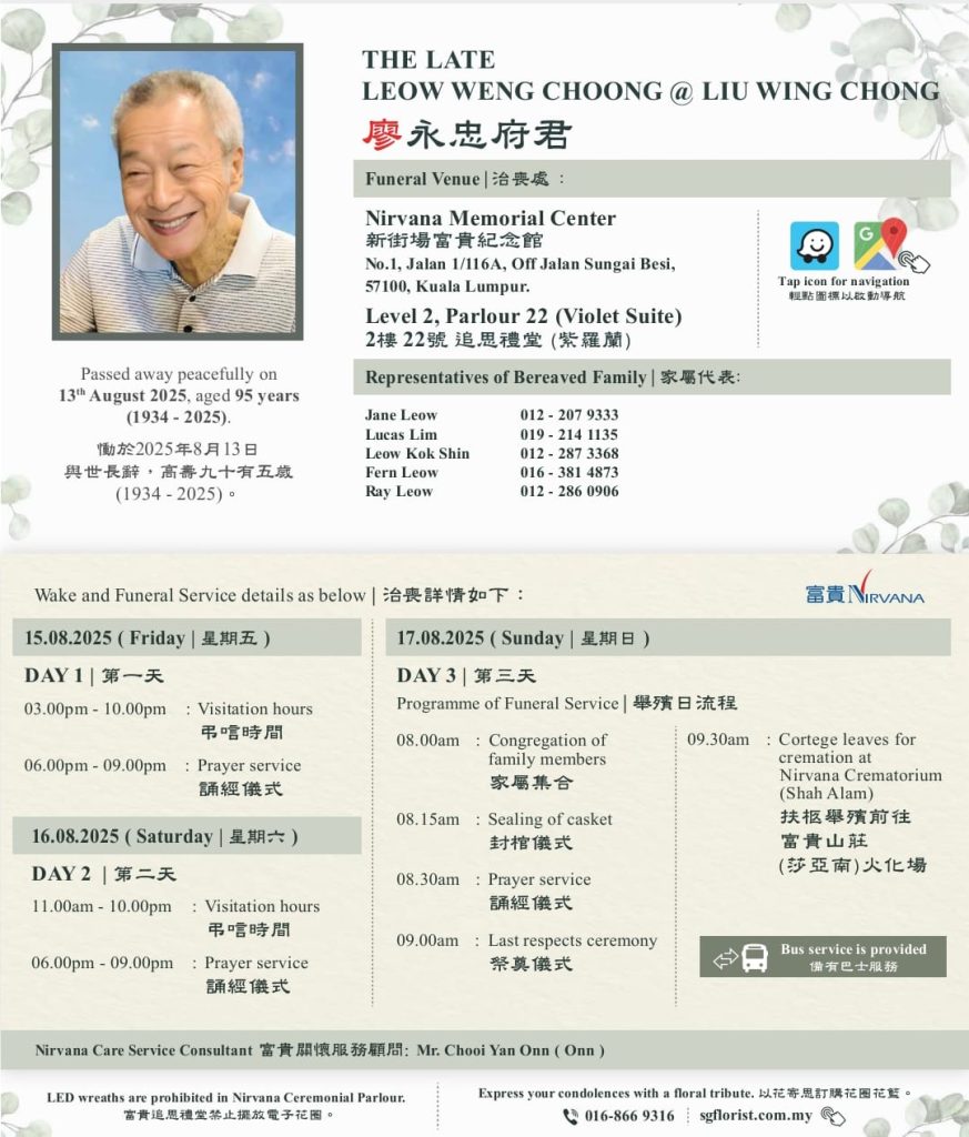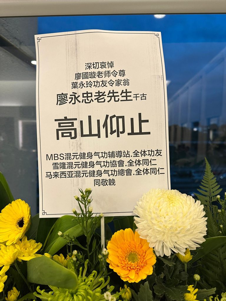 马来西亚混元健身气功总会理事, 雪隆混元健身气功协会副会長, MBS辅导站前任站長廖國璇老师令尊往生